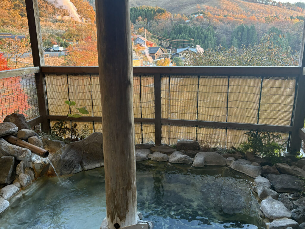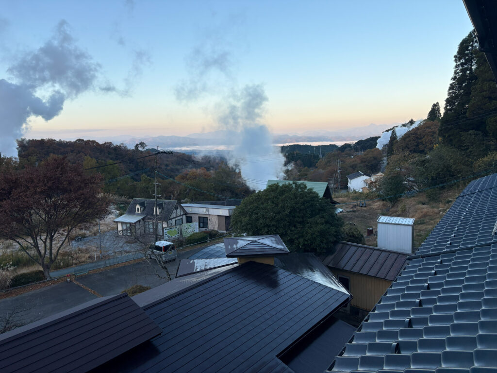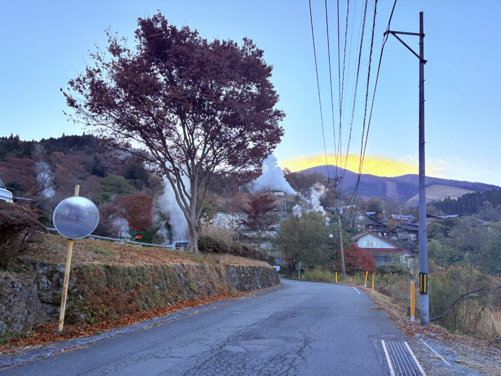 朝になると小国らしい美しい秘境の風景が見られます。温泉のけむりがとてもエモいです。