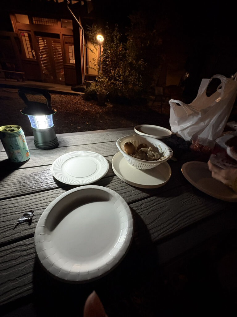 ご飯はスーパーで買ってきた豚肉、肉まんなどを蒸して食べました。少し寒かったですが外で食べる熱々のご飯は最高でした。